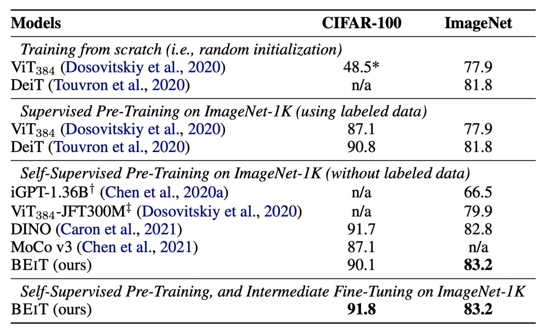 BEIT通过dVAE解决了图像离散化的问题,同时基于ViT成熟的Vision Transformer结构,最终实现了MLM在CV领域无监督学习的应用。从下面的实验结果也可以看出,采用BEIT进行预训练会显著提升图像分类效果,并且无监督预训练的效果要好于之前的iGPT、VIT等CV Transformer模型,同时也优于对比学习方法MoCo。