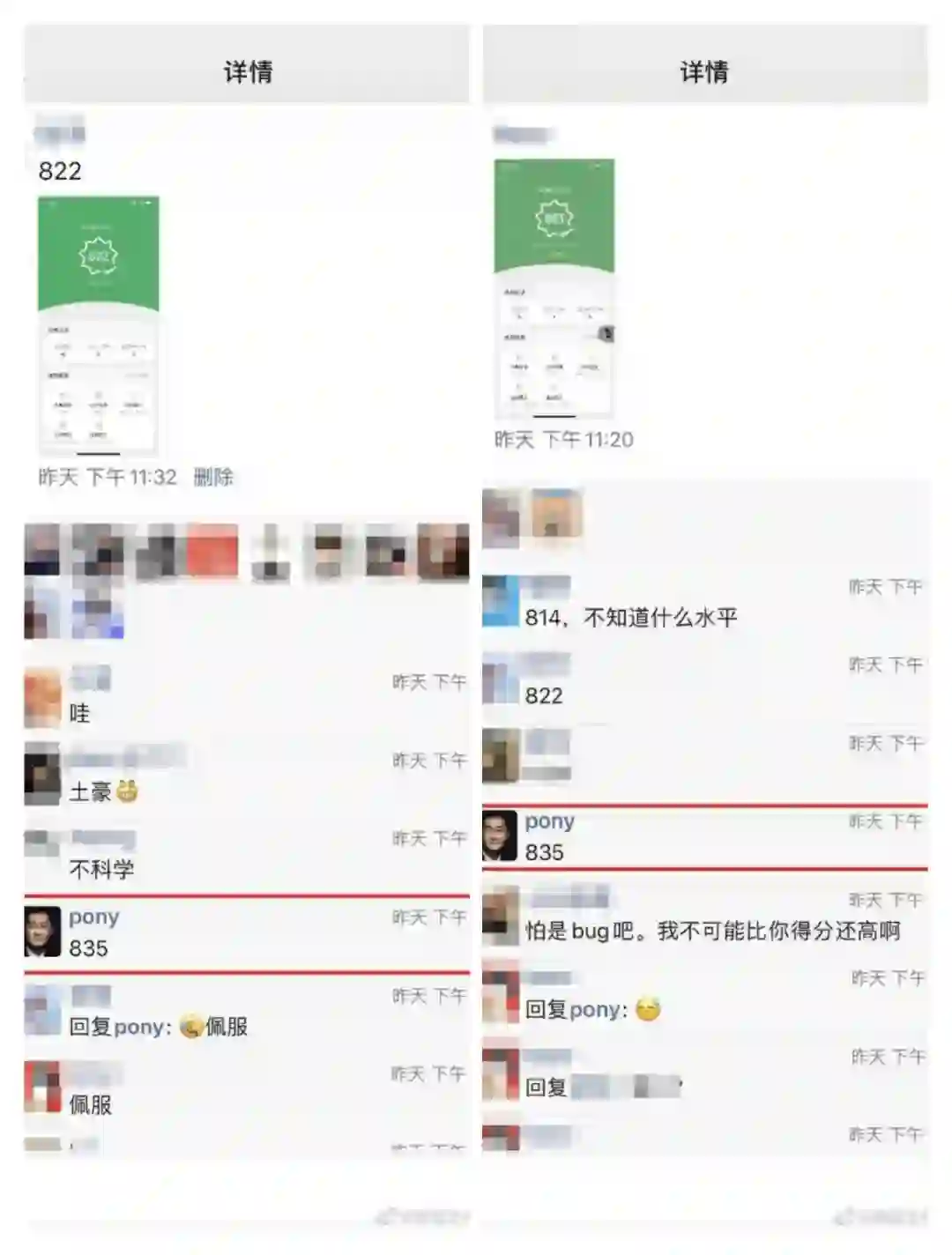但仅仅10分钟后,腾讯微信团队激动地表示,一位腾讯女员工在朋友圈晒出了 848 分的高分,超越了马化腾,但并不清楚该员工的身份。