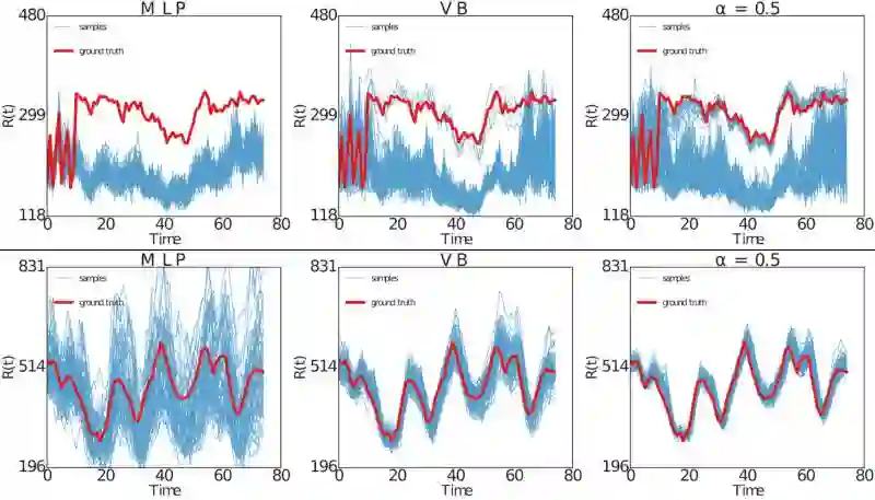 下图显示,对于固定的动作序列,使用与1)多层感知器相对应的模型产生的roll-out,该多层感知器假定加性高斯噪声(MLP)和我们的贝叶斯神经网络训练2)变异贝叶斯(VB)或3 )α分散最小化,α= 0.5。模拟的轨迹显示为蓝色,“工业基准”产生的地面实况显示为红色。