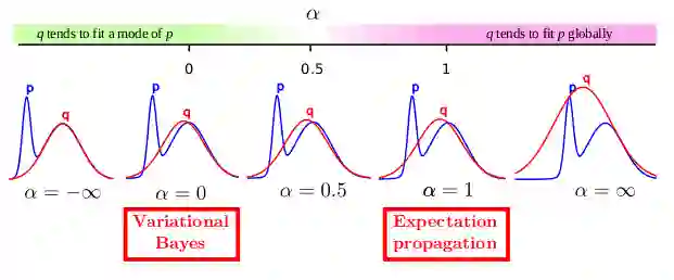 其实,对于如何学习因式分解后的高斯近似,我们可以通过最小化α发散来实现,而不使用VB。关于α发散,在Minka, Thomas P所著的《散度度量和消息传递》和我与Li Y.等人所著的《黑箱α发散的最小化》中皆有所提及。通过改变这种发散中的α值,我们可以在真实的后验分布p模式下进行平滑的插值,也可以在p中覆盖多种模式,如下图所示: