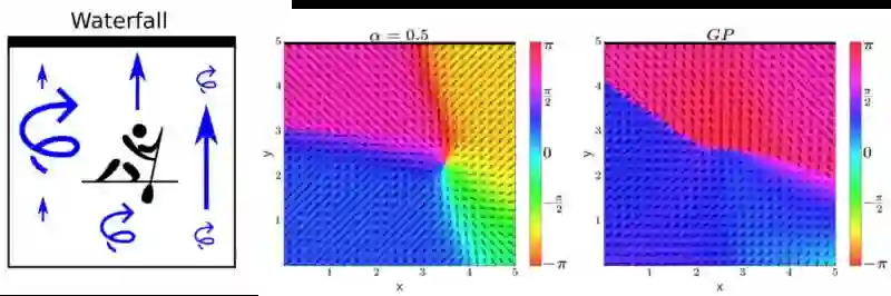 我们现在考虑一个强化学习基准,其中一个划独木舟在二维的河上划桨,如下图最左边的地图所示。在一个漂流的河中,将划独木舟推向位于顶部的瀑布,漂移在右边更强,左边更弱。 如果独木舟落下瀑布,他必须在河底重新开始。
