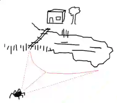 蜘蛛要回家的话,它有两个可能的路径:穿过湖上的桥或者绕着湖边走回家。在没有噪音的情况下,桥梁是比较好的选择,因为它更短。然而,在大量饮酒后,蜘蛛的运动可能会随机地左右随摇晃。考虑到桥梁狭窄,且蜘蛛不喜欢游泳,所以现在较优的选择是沿着湖边走回家。
