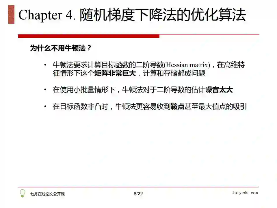 那到底如何优化随机梯度法呢?详情请点击:论文公开课第一期:详解梯度下降等各类优化算法(含视频和PPT下载)(链接:https://ask.julyedu.com/question/7913)。