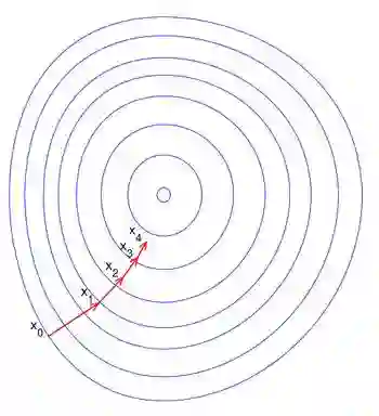 总之,梯度下降法的优化思想是用当前位置负梯度方向作为搜索方向,因为该方向为当前位置的最快下降方向,所以也被称为是“最速下降法”。最速下降法越接近目标值,步长越小,前进越慢。梯度下降法的搜索迭代示意图如下图所示: