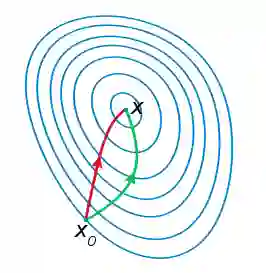注:红色的牛顿法的迭代路径,绿色的是梯度下降法的迭代路径。