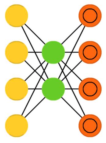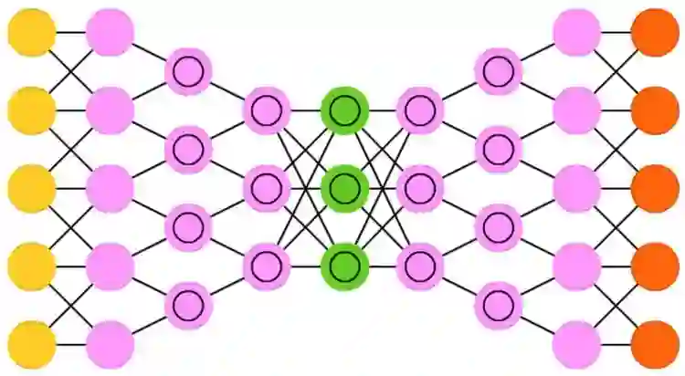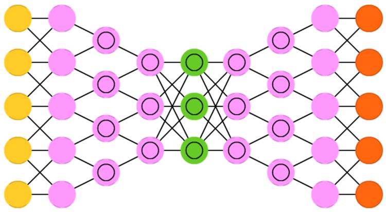 自编码器的基本思想是自动编码信息。自编码器网络结构像一个漏斗:它的隐藏层单元比输入层和输出层少,并且关于中央层对称。最小的隐藏层总是处在中央层,这也是信息压缩程度最高的地方。从输入层到中央层叫做编码部分,从中央层到输出层叫做解码部分,中央层叫做编码(code)。