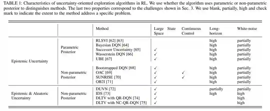 强化学习中⼀般考虑两类不确定性,其中引导往认知不确定性⾼的区域探索可以促进智能体的学习,但访问环境不确定性⾼的区域不但不会促进智能体学习过程,反⽽由于环境不确定性的⼲扰会影响到正常学习过程。因此,更合理的做法是在乐观对待认知不确定性引导探索的同时,尽可能地避免访问环境不确定性更⾼的区域。基于此,根据是否在探索中考虑了环境不确定性,综述中将这类基于不确定性的探索策略分为两个⼩类。