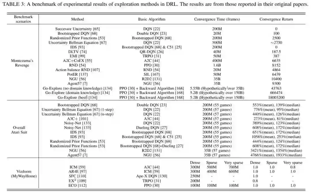 为了对不同的探索⽅法进⾏统⼀的实验评价,综述总结了上述⼏种有代表性的⽅法在三个代表性 benchmark上的实验结果: 《蒙特祖玛的复仇》,雅达利和Vizdoom。