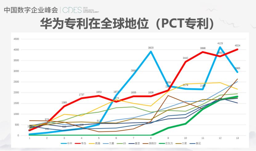 美国为什么要用这么大的力量来做这件事?这张图是目前全世界在PCT专利上掌握专利最多的企业前10名。蓝线是中兴掌握的专利,红线是华为。在前10个企业当中,有一个新兴企业成长速度非常快,就是京东方,这条绿线。可以说美国打的非常精准,都是中国掌握核心技术最强的企业。
