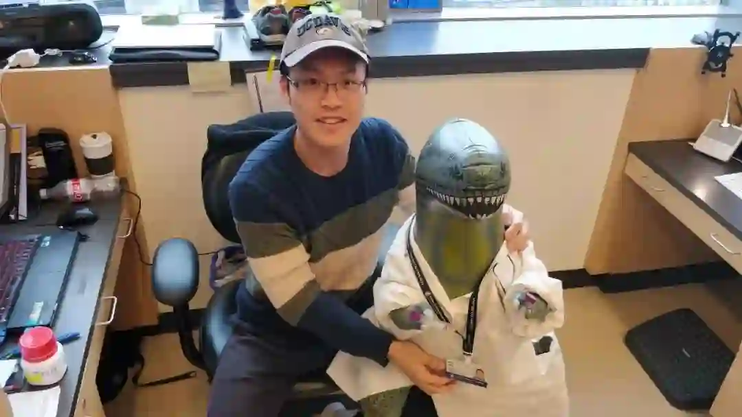 魏伟与哈佛大学医学院Thomas L. Schwarz实验室吉祥物恐龙先生的合影