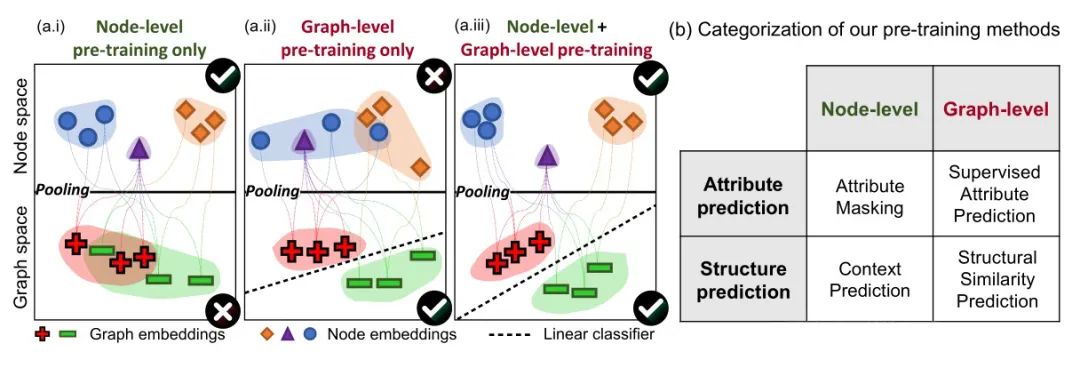 然而不是所有的预训练任务都对下游的任务有效,甚至会产生负迁移现象。作者认为,一方面,不是所有预训练任务与下游任务相关(需要领域专家进行任务选择);另一方面只采用整图级的预训练,会造成单个节点编码的分布不清晰现象,从而造成负面影响,故这里提出先做节点级的预训练,再做整图级的预训练。