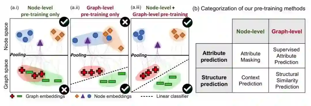 (1)经典的 deep walk、node2vec、line、Deep Graph Infomax 等,均是在节点级别上进行编码,目标通常是预测节点属性或者链路预测,这样的编码在处理整图级别任务往往不是最优的;文章中阐述了,只使用整图级编码预训练,又会受节点编码区分不明显而限制模型效果。所以两者需要结合,可以类比 bert 的思想,填空是为了预测词,NSP 是整句的主题预测,即不仅考虑单词的语义,还要考虑句子的语义。