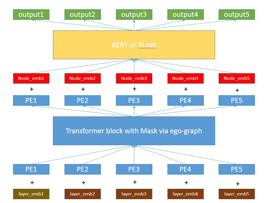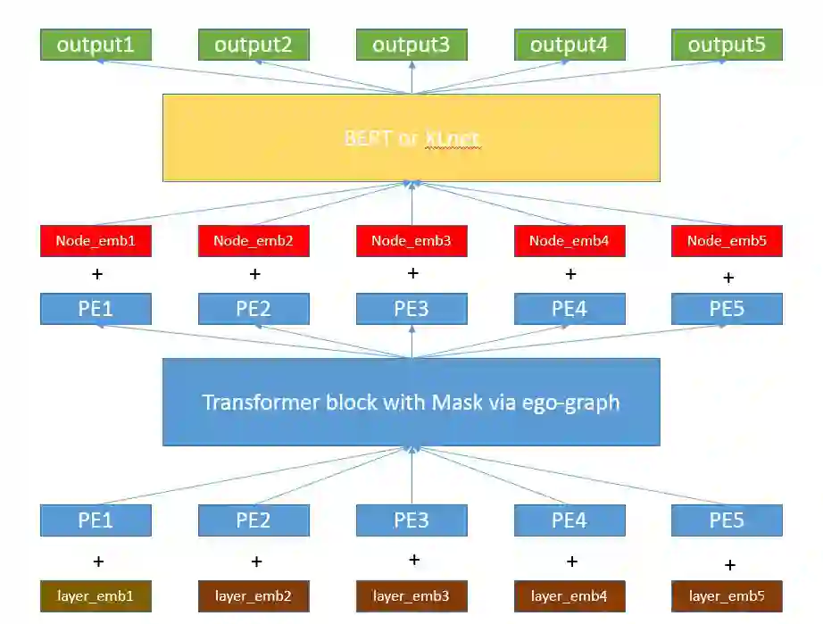 ▲ 整体模型框架,先把层级位置编码+相对位置编码送入一个 transformer 模块,其中使用到的 Mask 矩阵由辅助连接变量构造,控制遍历图的层级顺序。