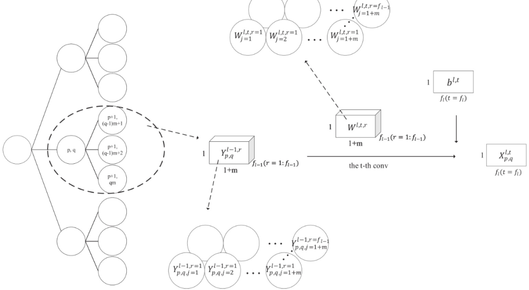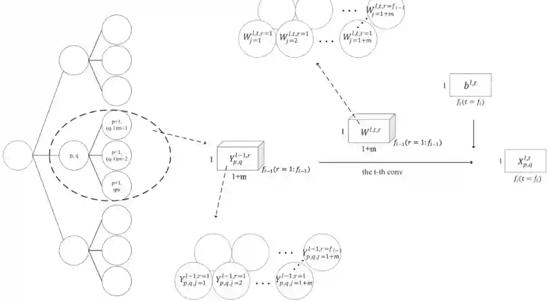 接着再引入一个超参数H,代表树的深度,见上图最左边即为 K=3,H=3 的情形。此时“卷积”可以认为是每个节点 K 邻居那个样子(图中虚线椭圆画出的样子),移动的顺序是在树上从上到下,从左到右。这种方式跟标准的 CNN 很像了。