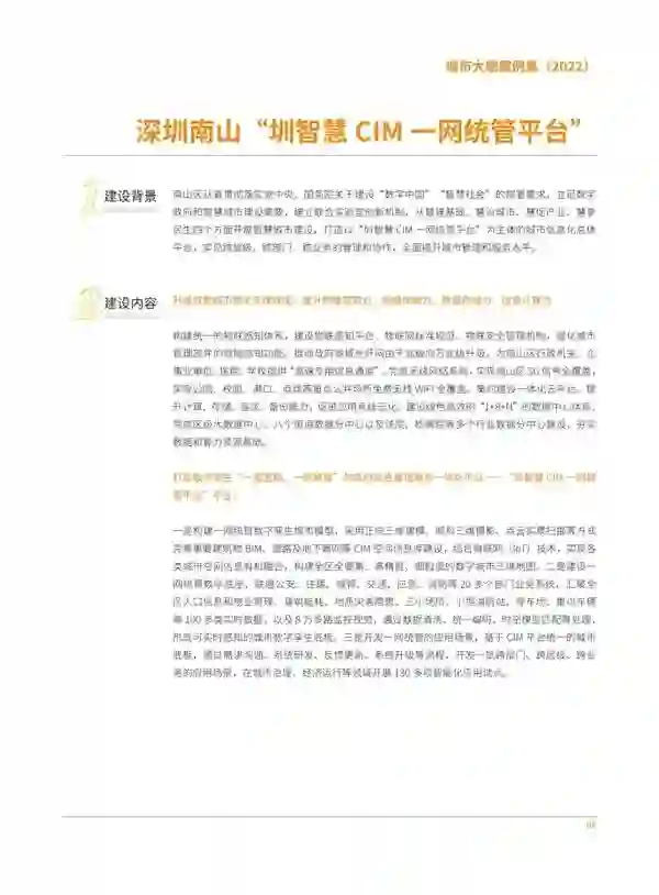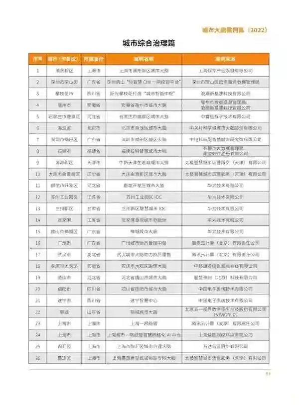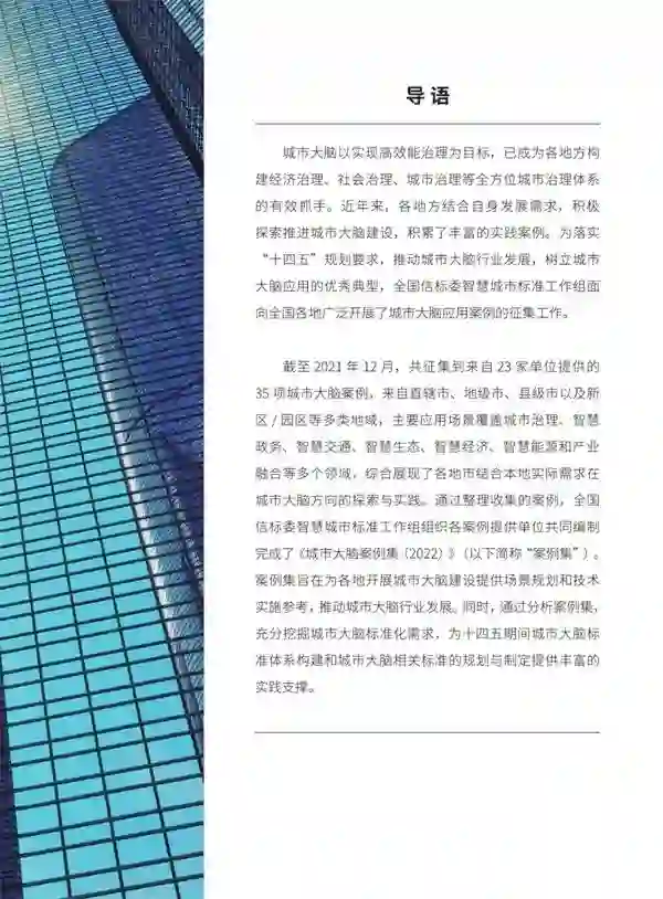 截至2021年12月,共征集到来自23家单位提供的35项城市大脑案例,来自直辖市、地级市、县级市以及新区/园区等多类地域,主要应用场景覆盖城市治理、智慧政务、智慧交通、智慧生态、智慧经济、智慧能源和产业融合等多个领域,综合展现了各地市结合本地实际需求在城市大脑方向的探索与实践。通过整理收集的案例,全国信标委智慧城市标准工作组组织各案例提供单位共同编制完成了《城市大脑案例集(2022)》(以下简称“案例集”)。