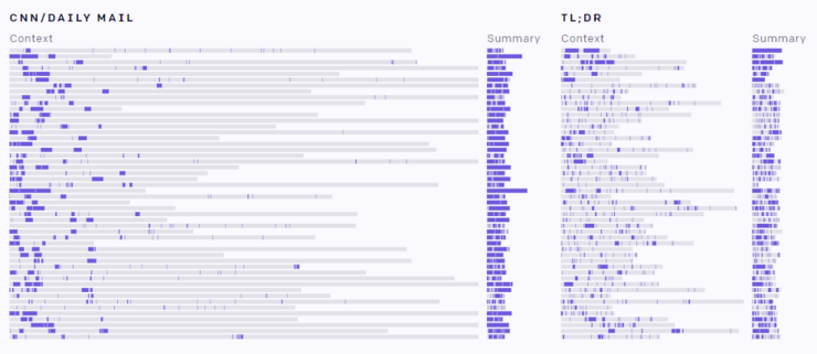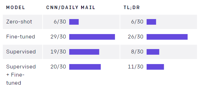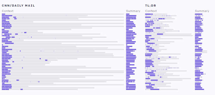 不过另外也需要说明,虽然原始预训练 GPT-2 和有监督学习的 GPT-2 模型输出的文本中直接复制的痕迹最轻微(新颖性最高),但它们输出的文本表达的内容也新颖性最高 —— 也就是说它们的总结并不准确,这仍然不是我们希望看到的。