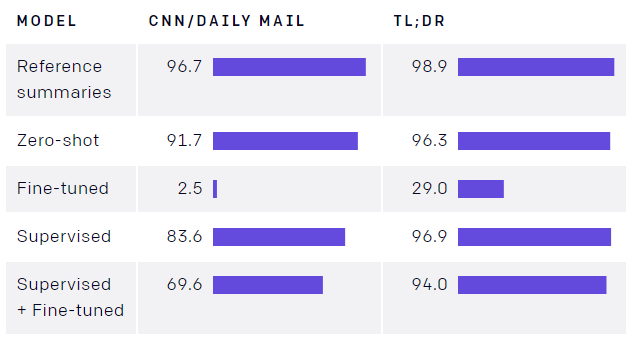 后一个文本总结任务也分为了两个子任务,CNN/Daily Mail 数据集上的报道文章总结,以及 TL;DR(「太长,不看」)数据集上的 Reddit 讨论的总结。