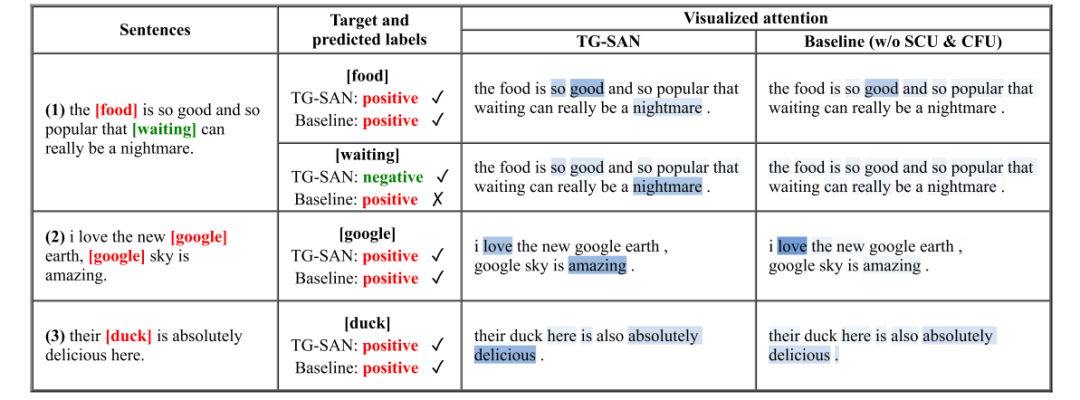 更重要的是,作者随后做了Case Study,在句内含义较为隐晦时,对象内情感一致性可以通过其他句子给出正确的判断;而在更为隐晦而难以判断的文本中,跨对象情感倾向性可以发挥作用,通过整体的情感判断给出某个对象的情感。