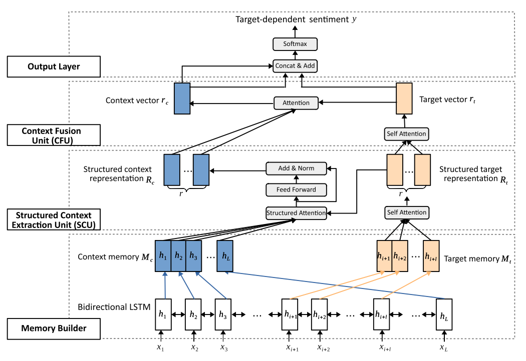 本文构建的模型为对象导向的结构性注意力网络(Target-Guided Structured Attention Network, TG-SAN),包括两个核心单元,其一是结构性上下文抽取单元(Structured Context Extraction Unit, SCU),其二是上下文融合单元(Context Fusion Unit, CFU),分别承担为语意群编码和将它们(根据与对象的关系)进行合并的任务。