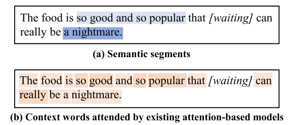来自Wisers AI Lab的几位研究者认为,对象级情感分类任务的重点在于挖掘对象词汇和上下文词汇的关系,而既有研究都将词汇看作单独的语意单元;本文作者提出,这样的假设忽略了句子其实是由若干语意区块构成的,在语意区块(片段)中几个单词联合表达一个含义,是不同语意片段(而非单词)在对对象产生着影响。如下图(a)所示,如果关注语义片段的作用,在预测“waiting”的情感倾向时,“so good and so popular”的重要性将整体低于“a nightmare”;但若以单词为分析单位,因为距离和词性不同,“popular”等词会获得比“nightmare”更多的注意力,因此得出相反(也是错误的)判断。因此本文试图挖掘句中表达特定含义的上下文片段,并将这些片段根据与对象的关系进行融合。