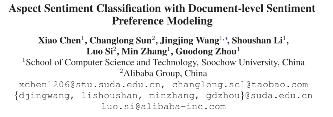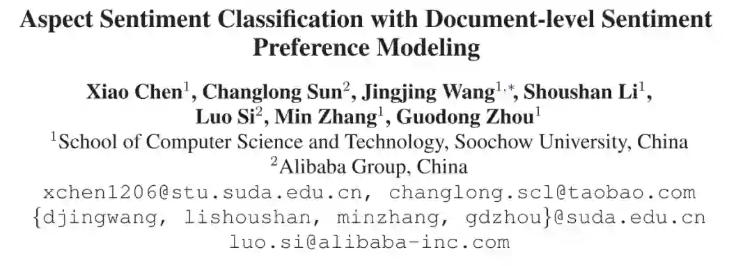 [1] Chen, Xiao, et al. "Aspect Sentiment Classification with Document-level Sentiment Preference Modeling." Proceedings of the 58th Annual Meeting of the Association for Computational Linguistics. 2020.