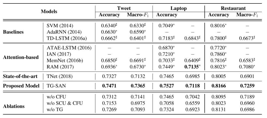 在推特数据集和SemEval-2014的笔记本电脑、餐馆数据集上,本文的模型都取得了较好的成果,且销熔实验也证明两个核心模块都对实验结果有一定的提升。在Case Study部分,作者分别针对多对象、同对象多次出现、单对象的句子做了分析,发现本文的方法不但能比基线方法的判断正确率更高,且能准确定位到做出判断的词汇,权重分配较鲜明,证明该方法能学习到句中有关情感判断的知识。