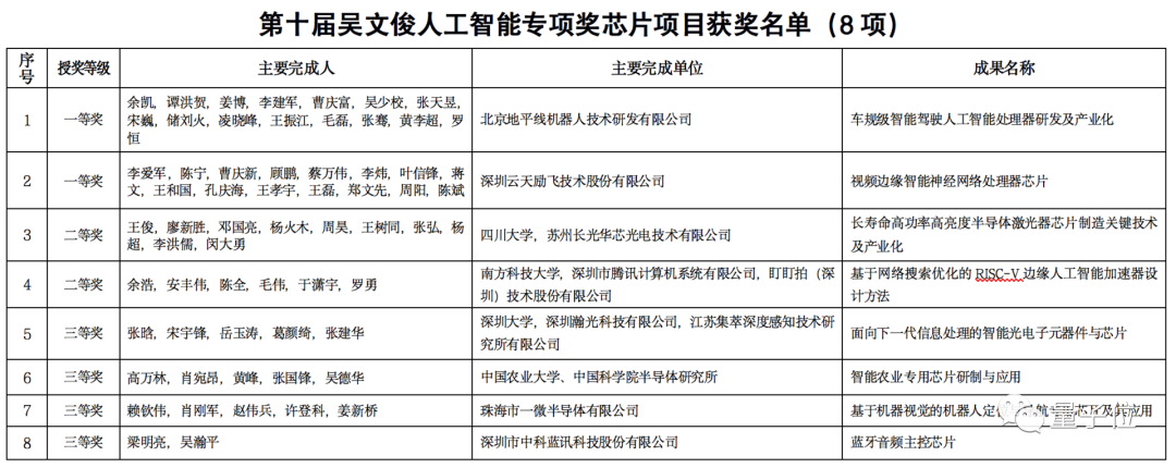 除了前面详细介绍的两个奖项,本届还设立了人工智能自然科学奖、人工智能技术发明奖&科技进步奖、人工智能优秀青年奖、人工智能专项奖芯片项目。