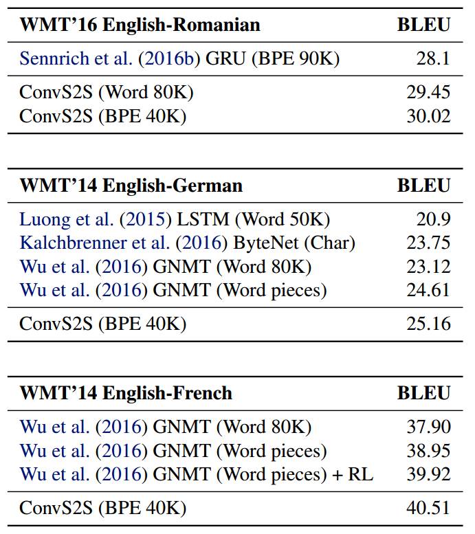 FAIR 使用门控线性单元(gated linear units,GLU)缓和了梯度传播,还在每个解码器层上都装了一个独立的注意力(attention)模块。在机器翻译比赛 WMT'14 中,FAIR 的架构的“英语-德语”和“英语-法语”翻译的准确度超过了 Wu 等人(2016) 的深度 LSTM 架构,而且在 GPU 和 CPU 上的运行速度也有数量级的提升。