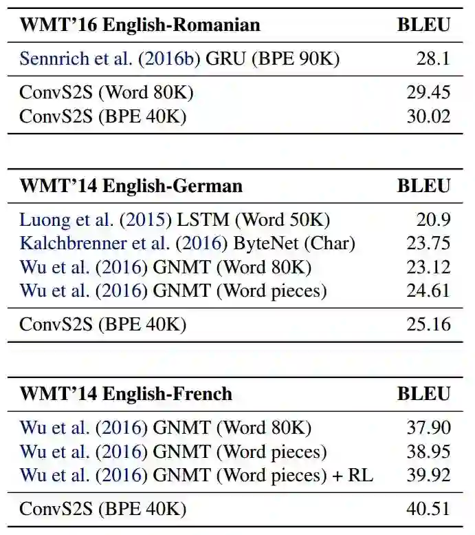 我们在几个公开的翻译基准数据集上都取得了目前最好的成绩。在“WMT'16 英语 - 罗马尼亚语”的任务中,我们超出目前最佳成绩 1.9 BLEU。相比 Wu 2016 年的 LSTM 模型,在“WMT'14 英文 - 法文”翻译任务中,我们进步了 1.6 BLEU,而在“WMT'14 英语 - 德语”翻译任务中,我们进步了 0.5 BLEU。