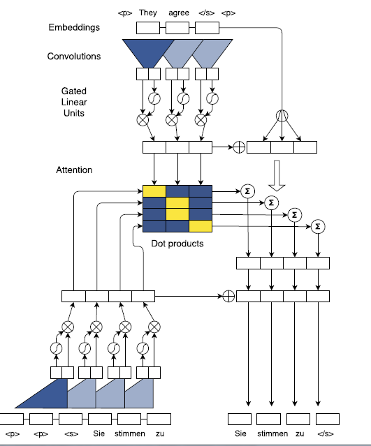 图1. 训练过程中的 batching 示图。我们对英语源语句进行了编码(顶部),并同时计算了四个德语目标单词(中部)的所有Attention值。我们的Attention正是解码器上下文标准(底部左侧)和编码器表征之间的点积。我们将Attention(中部右侧)计算的条件输入加到解码器状态中,预测目标单词(底部右侧)。S形框和乘法运算框表示的是门控线性单元。