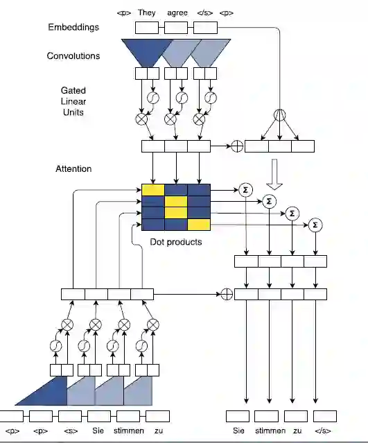 在最近的一些研究中,卷积神经网络已被用于进行序列建模,如 Bradbury 等人的研究(2016)提出在一连串卷积层之间进行循环 pooling;Kalchbrenner 等人的研究(2016)尝试不借助注意力机制处理神经网络翻译任务。但是这些方法在大型基准数据集上的成绩都没有超过当前最优成绩。Meng 等人在 2015 年曾探讨过利用 Gated convolutions 完成机器翻译任务,但是他们评估的对象只限于一个小数据集,而且用的还是一种与传统的基于计数的模型协作的模型。这种部分卷积的架构在处理较大的任务时表现优异,但是他们的解码器仍然是循环网络(Gehring 等人, 2016)。