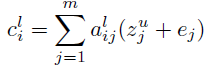 当前解码器层的条件输入 c 是编码器输出以及输入元素嵌入 e (图1,右侧中部)加权总和: