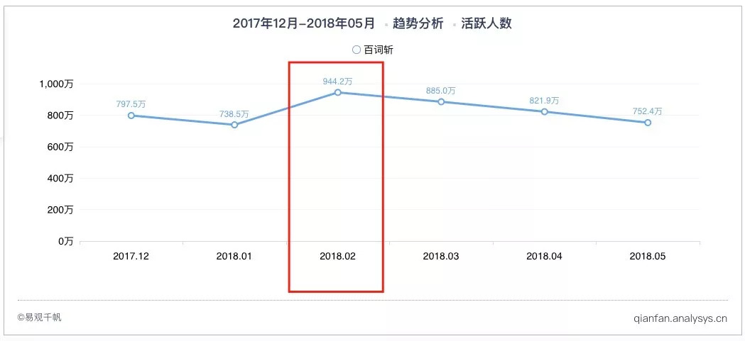 根据易观千帆的数据显示,百词斩在2018年1月底推出撒币活动后,2月用户活跃人数直线上升,高达944.2万。而对比另一外语学习头部APP英语流利说,在启动次数和使用时长来看,百词斩45.42%、37.75%的环比增速远高于英语流利说,百词斩的微信裂变式营销传播的确非同凡响。