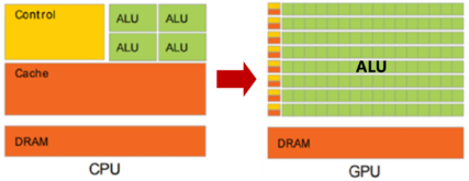 GPU被称为图像处理器,是从事图像和图形处理的专用微处理器。CPU与GPU的对比如图所示。CPU是通用处理器,需要兼顾计算和控制功能。其运算逻辑单元(ALU,Arithmetic Logic Unit)资源较少,每个核中只有约30%的晶体管是计算单元,而70%的晶体管承担控制器和寄存器的功能。CPU自身存在的局限性,已经难以满足人工智能应用需求。与CPU相比,GPU的ALU资源十分丰富,在逻辑控制单元的控制下,可以执行大规模并行加速计算,在图像处理和密集型数据并行处理等方面效率远远高于CPU,擅长处理重复性任务,通常用于人工智能算法训练。但是,GPU也存在硬件结构和功能相对固定,无法按需灵活配置等不足。