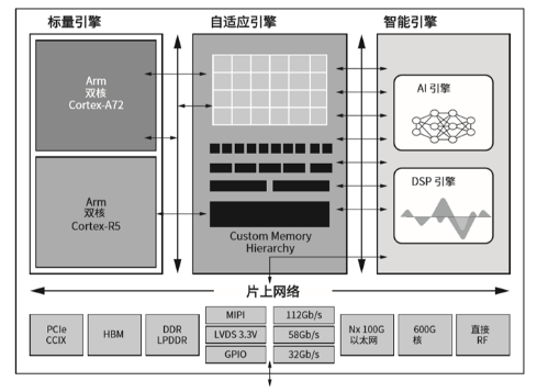 VERSAL ACAP是XILINX于2018年发布的全球首款自适应计算加速平台。其架构基于FPGA演化而来,整合了标量处理引擎、自适应硬件引擎和智能引擎以及前沿的存储器和接口技术,具有软件可编程、异构加速和动态自适应重配置等特征,能够通过软件抽象工具链快速开发优化应用,针对云端、边缘等不同领域的众多应用可支持AI推断加速,能够通过重新配置硬件实现功能快速动态调整。