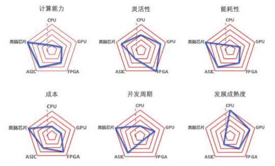 从计算能力、灵活性、能耗性、成本、开发周期、发展成熟度等方面对CPU和四类人工智能芯片进行综合对比,结果如图所示。可以看出,在计算能力方面,类脑芯片最强,ASIC次之;在灵活性方面,FPGA最高,类脑芯片次之;在能耗性方面,类脑芯片最低,ASIC次之;在成本和开发周期方面,类脑芯片和ASIC成本高周期长;在发展成熟度方面,CPU成熟度最高,GPU、FPGA次之,类脑芯片最具发展前景。