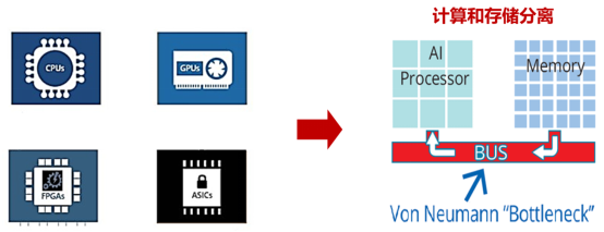 无论是通用芯片CPU,还是GPU、FPGA、ASIC等人工智能芯片,都是以计算和存储分离的冯·诺依曼架构为基础的。在冯·诺依曼架构中,数据从处理单元外的存储器提取,处理完毕后再写回存储器。由于运算单元和存储单元的接口存在输入/输出速度差异,当访问存储单元的速度无法匹配运算单元数据处理的速度时,即使再增加运算单元也无法进一步提高运算速度,这就是“冯·诺依曼瓶颈”。提高人工智能芯片性能和能效的关键在于支持海量数据运算和高效的数据访问。在面对海量数据实时计算场景时,受“冯·诺依曼瓶颈”限制,芯片计算加速能力难以无限提升。这就驱动着研究人员通过创新架构来提升人工智能芯片性能。