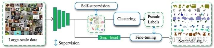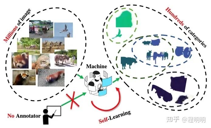 由于巨大的数据规模和隐私问题,为现实世界场景的海量图像进行像素级标注是十分昂贵的。缺乏足够的标注数据限制了大规模语义分割任务的发展。另一方面,用数百万张甚至数十亿张图片(例如ImageNet, JFT-300M, 和Instagram-1B)进行无监督/自监督训练得到的分类模型已经展现出与有监督学习相当的分类能力。这促使我们考虑是否可以通过无监督学习的方式实现真实世界场景语义分割的目标。为此我们提出了一个新的问题:大规模无监督语义分割(Large-scale Unsupervised Semantic Segmentation,LUSS)。如图1所示,LUSS 任务的目标是在没有人工标注监督的情况下,通过模型自我学习从大规模图像数据中总结出多样化的语义类别,并将成百上千个类别分配给数百万以上的图像中的每个像素。