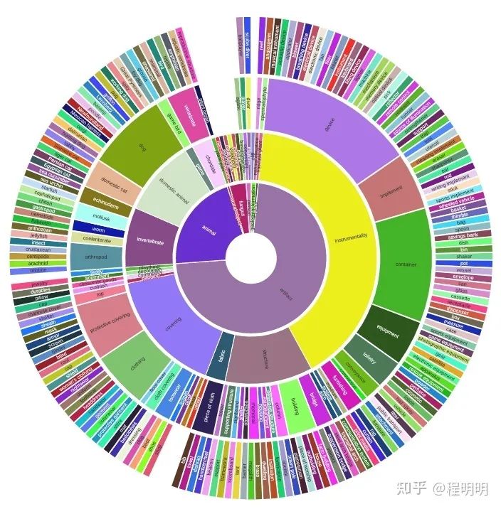 ImageNet-S数据集: 基于广泛使用的ImageNet[1]数据集中的精确像素级标签[1,2],我们提出了一个用于LUSS 任务的大规模像素级语义分割数据集 ImageNet-S。在移除了部分不可分割的类别后,ImageNet-S含有 ImageNet中的919 个类别和约120 万张训练图片。为更加全面地评测LUSS 任务并且探索未来的应用,我们为4万余张测试图片和约1%的训练图片(约9千张)提供了像素级语义分割标注。ImageNet-S 数据集为LUSS任务提供了多样性强的大规模数据,在充分展示LUSS任务的挑战性的同时也为模型获取丰富的表征信息提供了数据支持。如图表2所示,ImageNet-S在数量规模和类别多样性上远高于常用的语义分割数据集。且得益于ImageNet的WordTree结构,ImageNet-S具有层次化的多粒度类别分级(图3)。为方便在计算资源有限的情况下进行研究,我们也划分了包含300类和50类的子集。ImageNet-S可在https://github.com/LUSSeg/ImageNet-S下载使用。