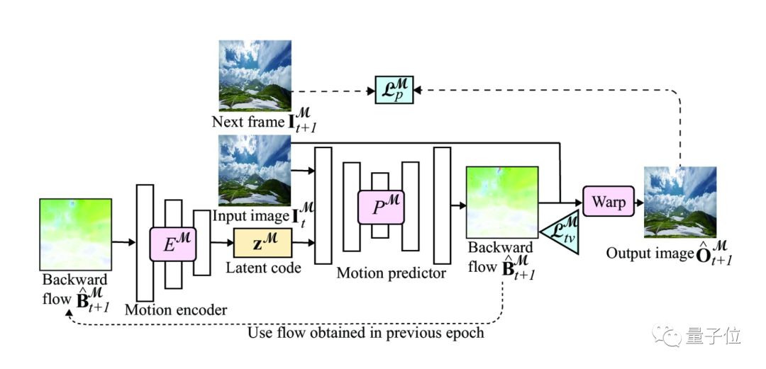 下图展示了视频合成的整个流程:给定输入图像和控制未来变化的潜在代码,运动预测器会生成将来的向后光流(backward flows)。
