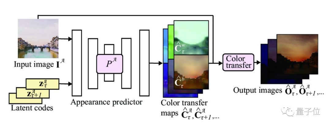最终,颜色迁移图通过输入图像和控制的潜在编码来共同计算完成。这种方法避免了反复直接从输入图像预测导致随时间变化的色彩。