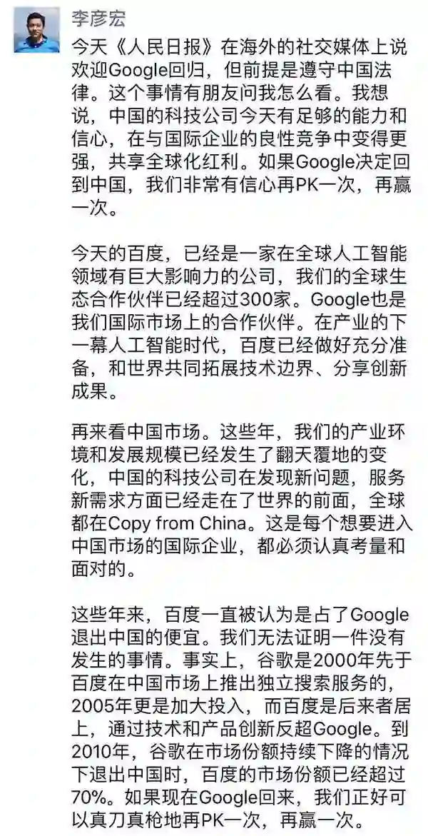 8月8日,“百度推广”发布了一条李彦宏点评“Google计划重返中国”新闻的微博内容:“Robin:如果Google决定回来,我们有信心再赢一次! ”,配图是李彦宏个人想法的全部内容截屏图。(注:Robin为李彦宏的英文名)李彦宏的一番表态在社交网络上引发热议。