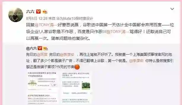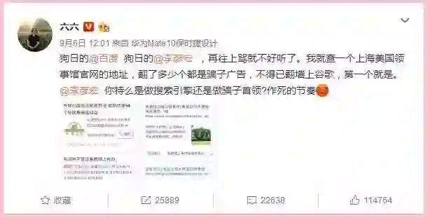 9月6日12时,经认证的新浪微博账号“六六”向百度的李彦宏喊话:“我就查一个上海美国领事馆官网的地址,翻了多少个都是骗子广告,不得已翻墙上谷歌,第一个就是。李彦宏,你特么是做搜索引擎还是做骗子首领?作死的节奏”。其实,这条微博内容的“开篇”,六六将同一个骂人的字眼用了两次,向百度和李彦宏表达她的不满和愤怒。