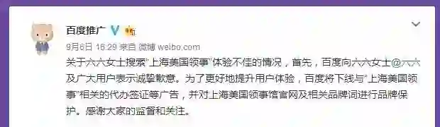 面对六六非常个人化的措辞,经认证的新浪微博账号“百度推广”代表百度在当天下午予以回应:“关于六六女士搜索‘上海美国领事’体验不佳的情况。首先,百度向六六女士及广大用户表示诚挚歉意。为了更好地提升用户体验,百度将下线与‘上海美国领事’相关的代办签证等广告,并对上海美国领事馆官网及相关品牌词进行品牌保护。感谢大家的监督和关注。”
