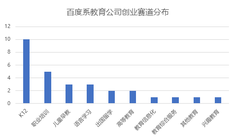 百度系的教育创业公司共 29 家,主要集中在 K12、职业培训、儿童早教、语言学习、出国留学等领域。其中,K12 领域的创业公司数量最多,其中不乏学霸君、作业盒子等知名在线教育平台;在职业培训领域也涌现了小灯塔、三节课等职场技能平台。百度系知名教育创业公司见下表: