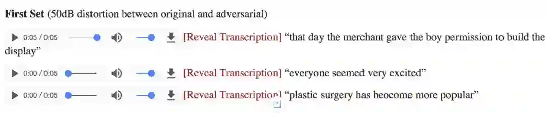 作者在个人网站上(https://nicholas.carlini.com/code/audio_adversarial_examples/)公布了一些对抗样本的样例。人耳听起来几乎一样的一段语音,(听起来都是一个带着咖喱口音的大叔在说「that day the merchant gave the boy permission to build the display」,只不过后两个样本中背景里有轻微的杂音)会被系统分别识别为三句截然不同的话。