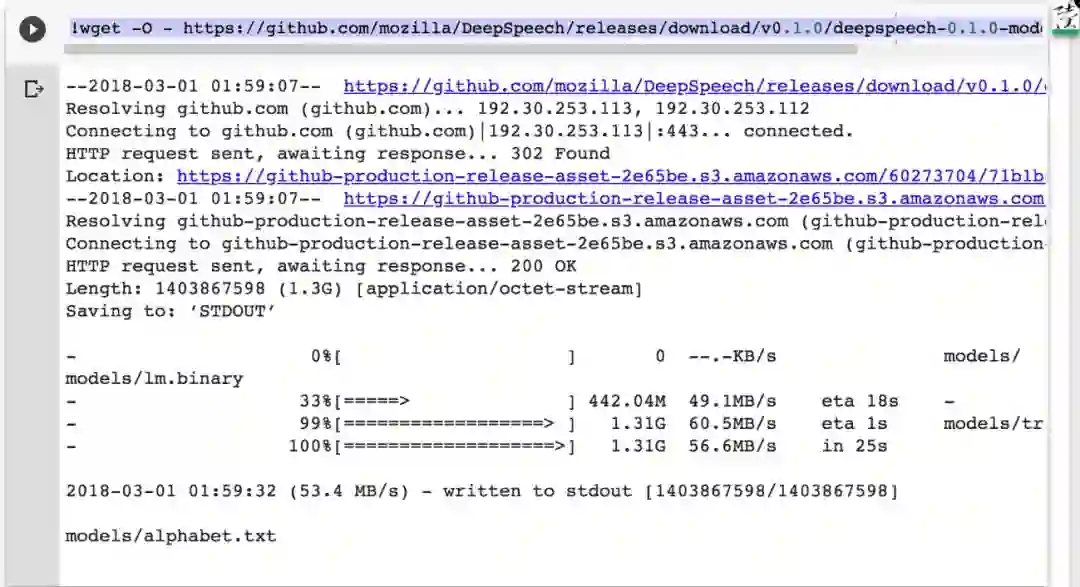 !wget -O - https://github.com/mozilla/DeepSpeech/releases/download/v0.1.0/deepspeech-0.1.0-models.tar.gz | tar xvfz -