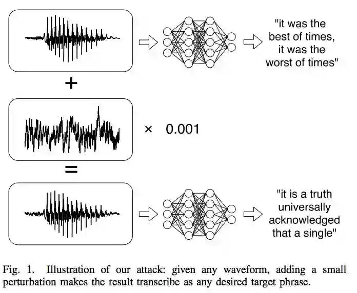 比如,上文中提到的「拳打 ICLR」的博士生之一,UC Berkeley 的 Nicholas Carlini 就与其导师一起,在《Audio Adversarial Examples: Targeted Attacks on Speech-to-Text》一文中给出了对 Mozilla 实现的百度 DeepSpeech 论文的一个白箱、定向、需要直接输入的攻击。给定任意一个波形,甚至不必须是语音,音乐乃至无声都可以,就能用优化的办法生成一个 99.9% 相似的、但是会被语音识别系统转写成完全不同的另一段话的新波形。