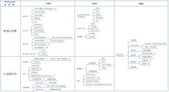 基于横向架构上的核心引擎和系统平台,MaxCompute在计算力、生态化、智能化3个纵向上着力发展差异化的竞争力。