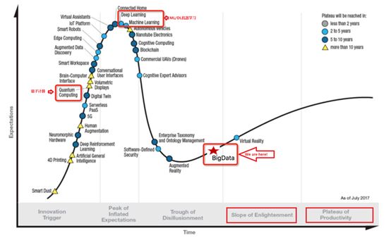 同时,与其他老牌系统相比(如,Linux等操作系统体系,数据库系统,中间件,很多有超过30年的历史),大数据系统又非常年轻,随云计算普惠,正大规模被应用。海量的需求和迭代推动系统快速发展,有蓬勃的生机。(技术体系的发展,可以通过如下Hype-Cycle概述,作者认为,大数据系统的发展进入技术复兴期/Slope of Enlightenment,并开始大规模应用Plateau of Productivity。)